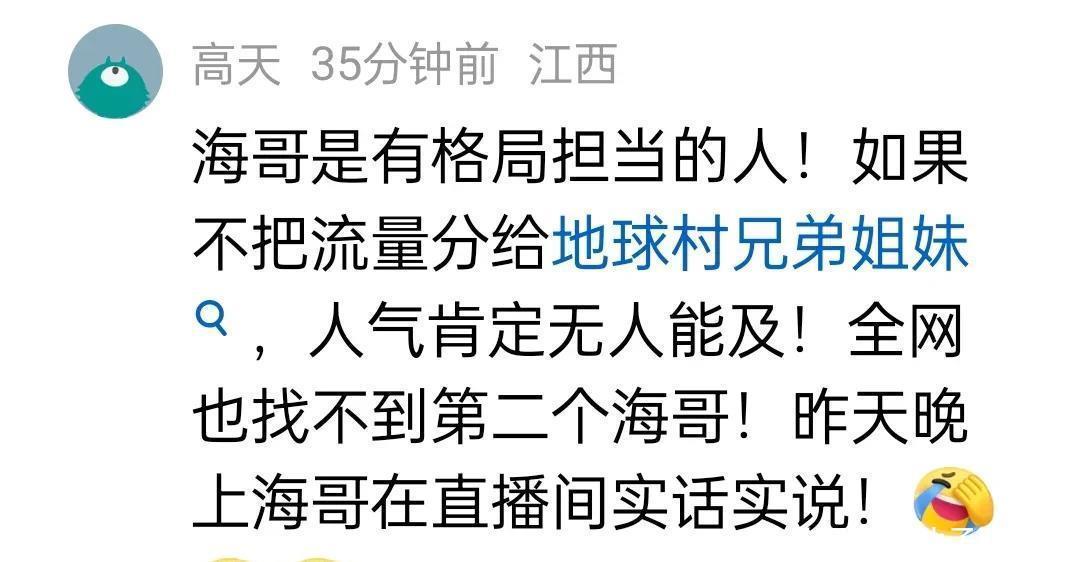 如果真像网友说的,地球村成员超过100人的话,海哥他是有压力的,既然是海哥的成员,他必须得把流量分给他的兄弟姐妹,不然的话,他独得一份流量,谁又能胜过他呢?既然是海哥的成员,必须要全部照顾到位,如果自己独得流量的话,他们的兄弟姐妹还会信任他吗,海哥考虑的非常长远,光看这一些还不代表什么?接下来我们最真实的言论开始了。