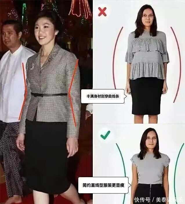 ②.避免曲线感对于身材丰满的女性来说,像↓图中这样的曲线条上衣尽量别再穿了,多余的线条只会加重身上的臃肿感,反观是以直线条为主的服装会更好,比如,收腰的X型、V型和A字型。
