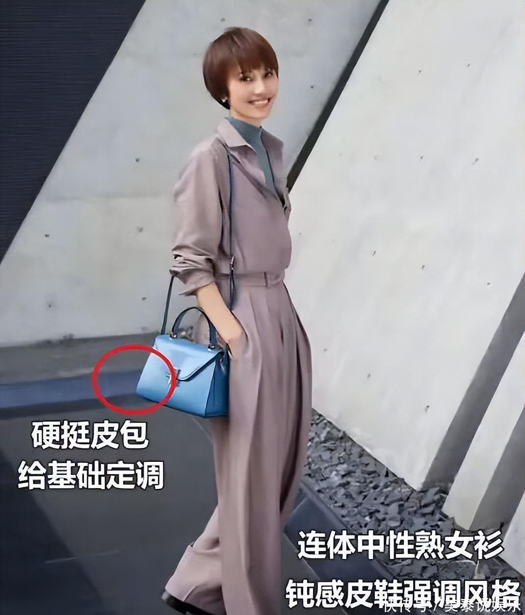 就像↓图中这一身同色系连体中性套装,加入材质硬挺的包包强调她的女人味,而脚下钝感强的皮鞋,又让她看起来很是帅气,丝毫不会出现大家所担心的割裂感,这是因为,袁泉在穿这套穿搭时,早已确定了整体的穿搭属性,其他的加入不过是为了提升穿搭时髦感。